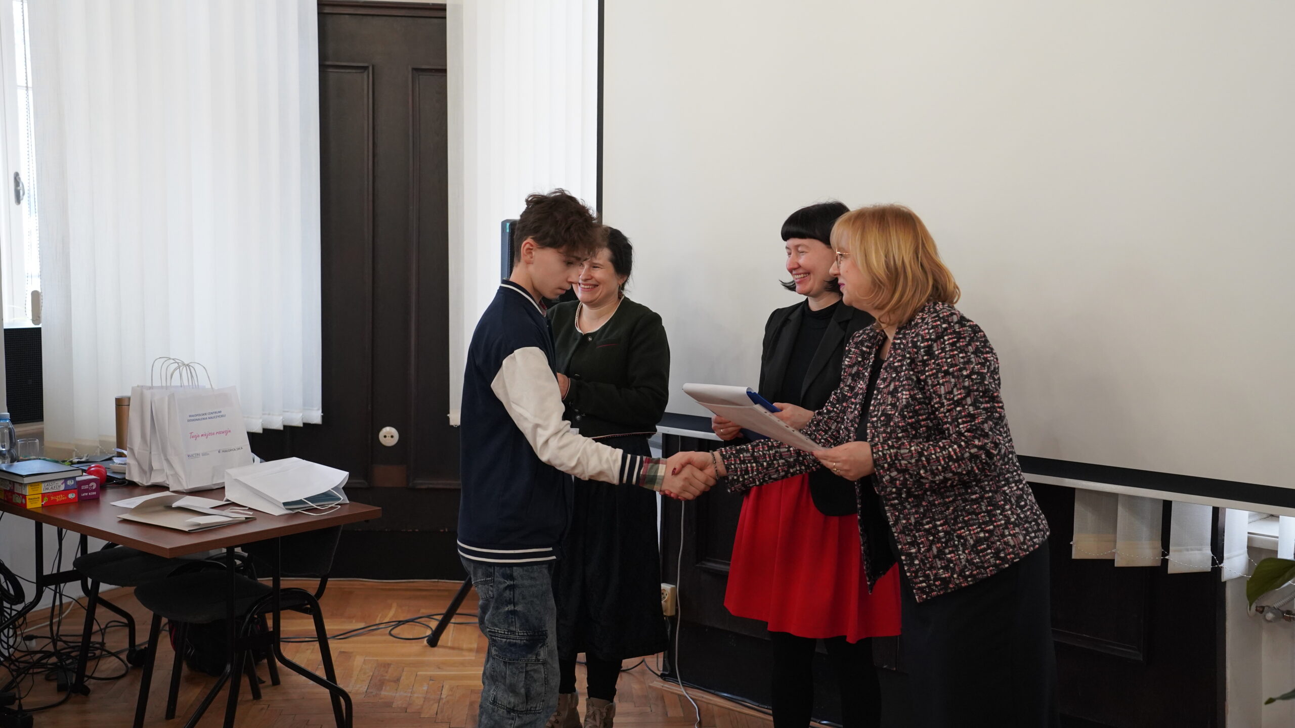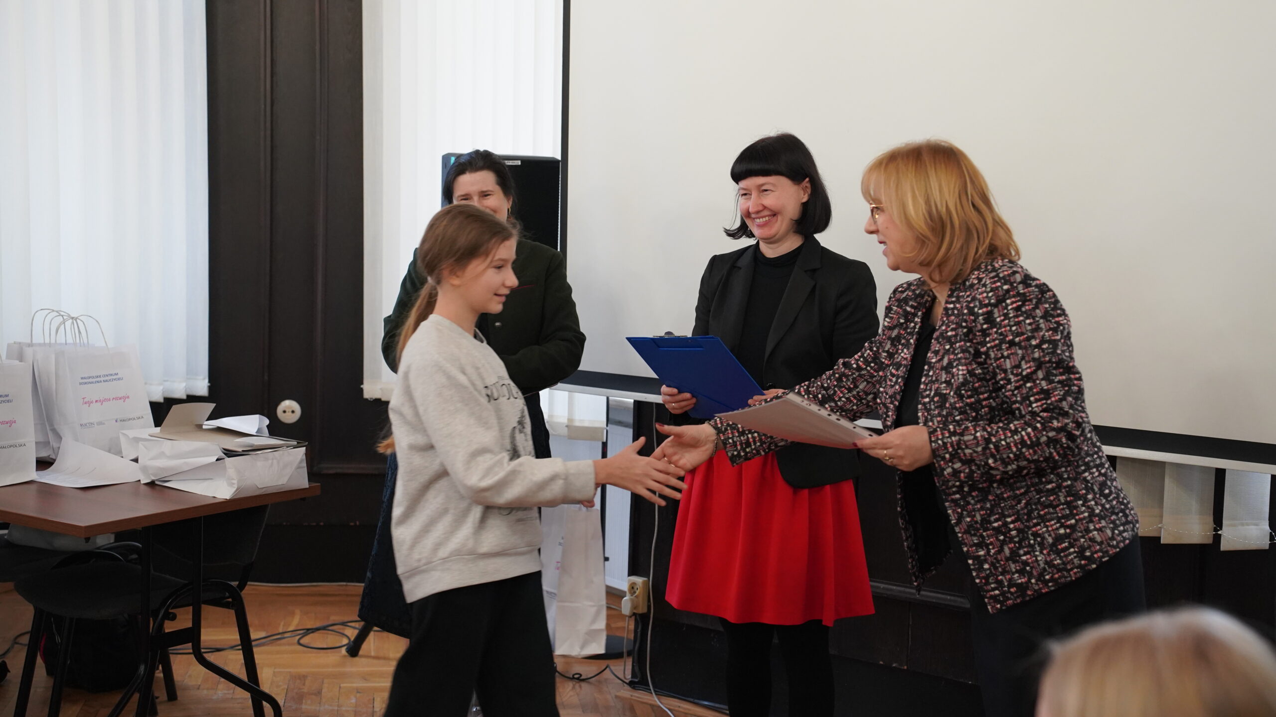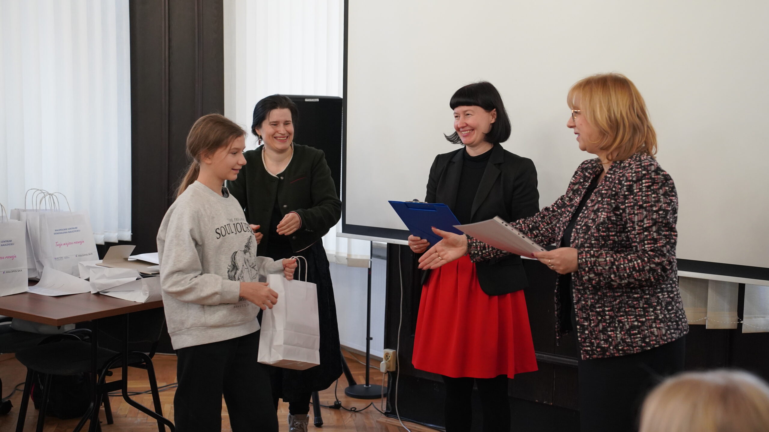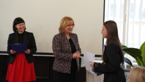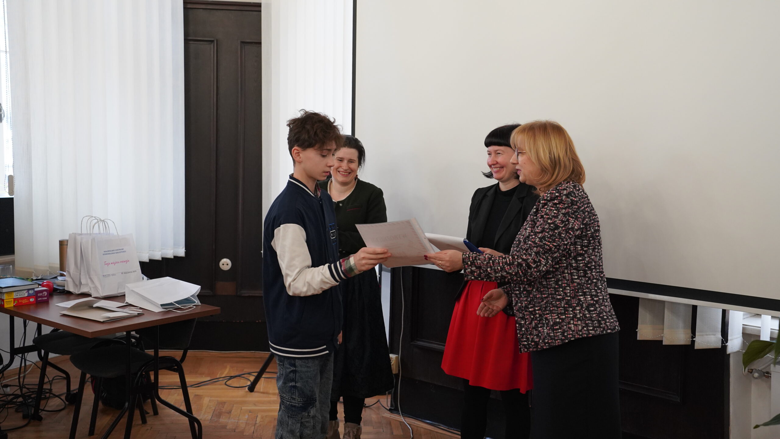 Środową uroczystość otworzyła swoim wystąpieniem pani dr Małgorzata Dutka-Mucha, dyrektor MCDN, podkreślając radość z aktywności uczniów oraz zaangażowania nauczycieli języka niemieckiego. Następnie głos zabrała pani Katarzyna Danilewska, przewodnicząca krakowskiego oddziału PSNJN, przedstawiając statystyki konkursowe. Kulminacyjnym momentem wydarzenia było wręczenie nagród wszystkim wyróżnionym uczniom.