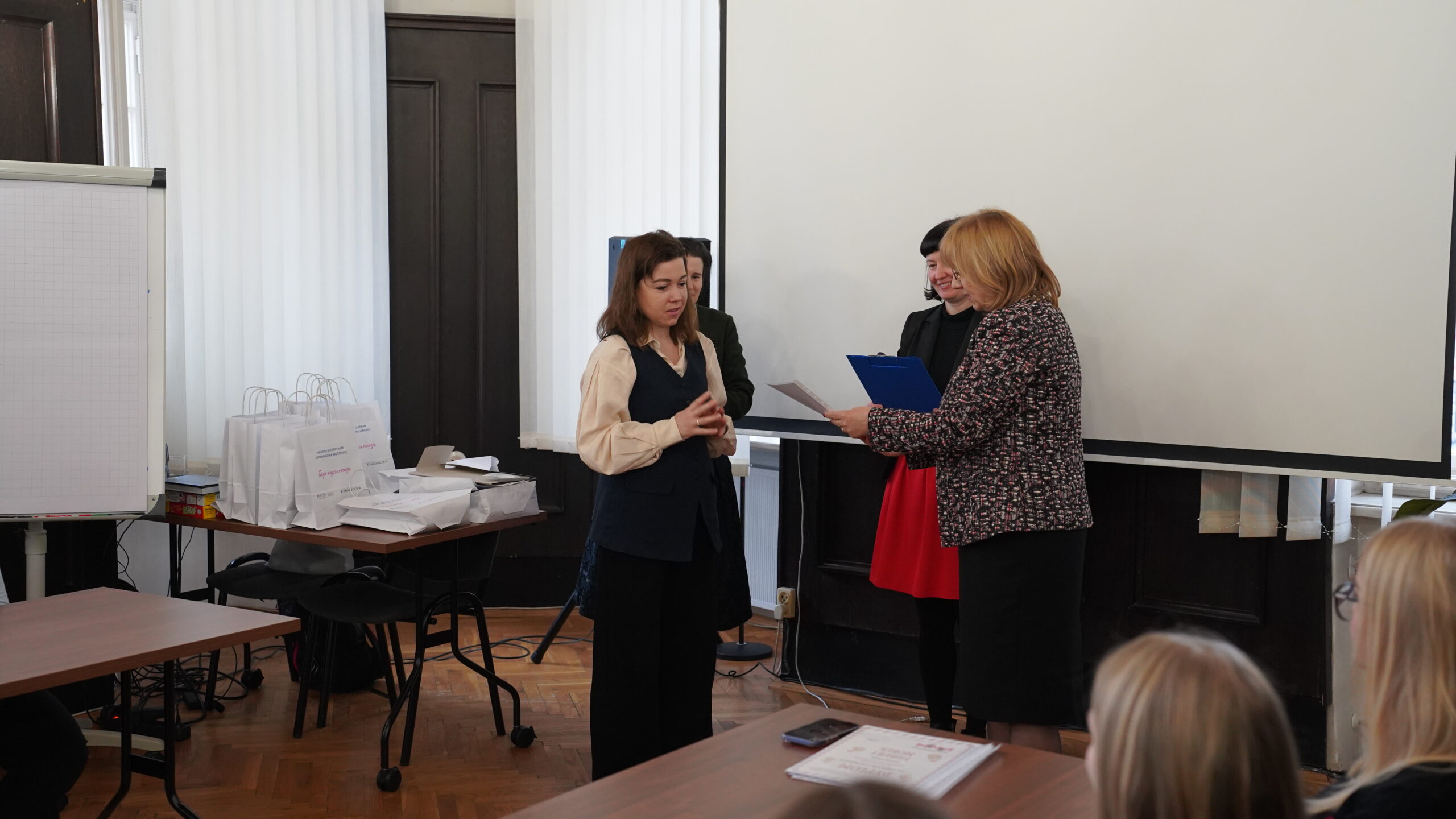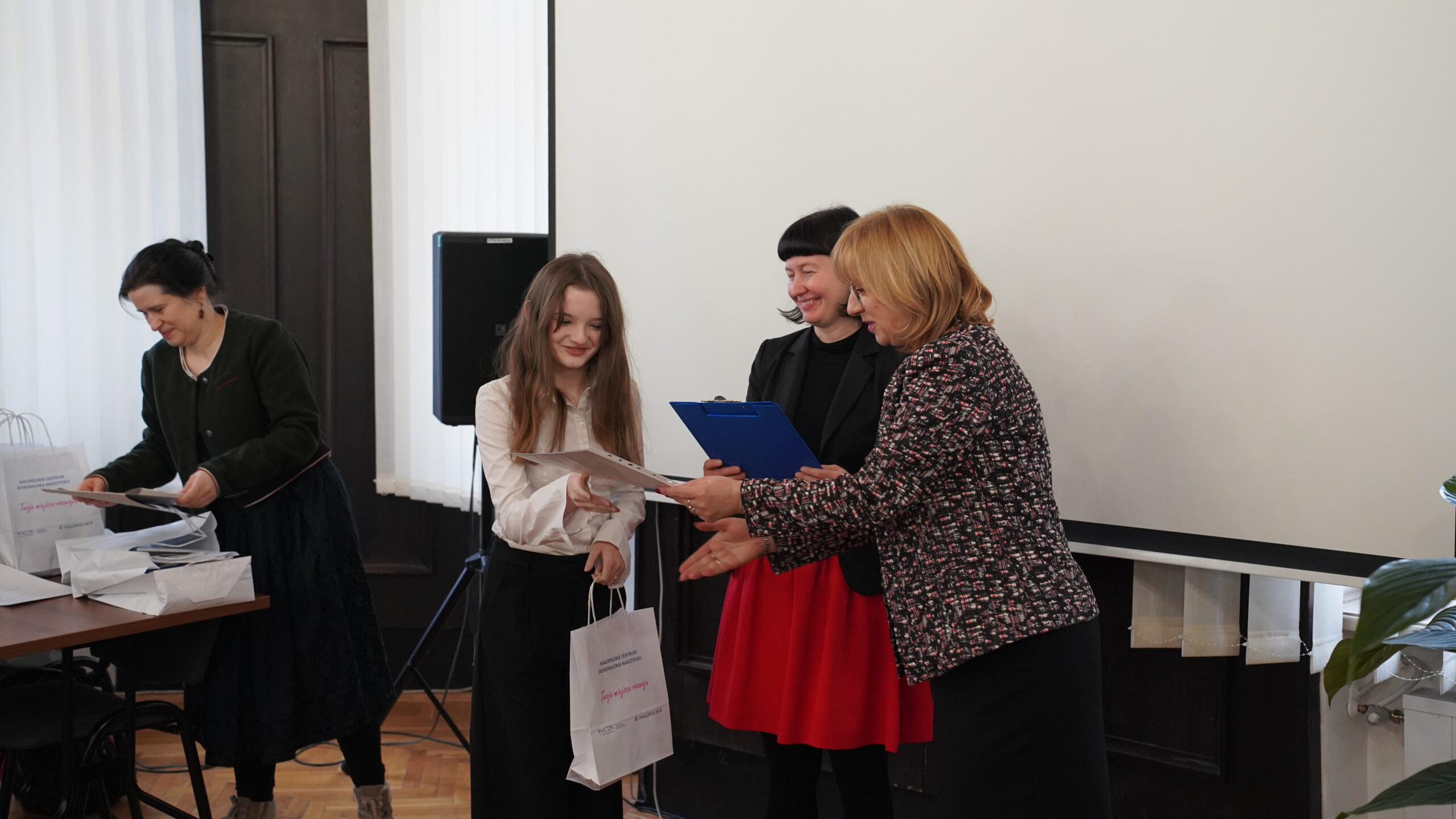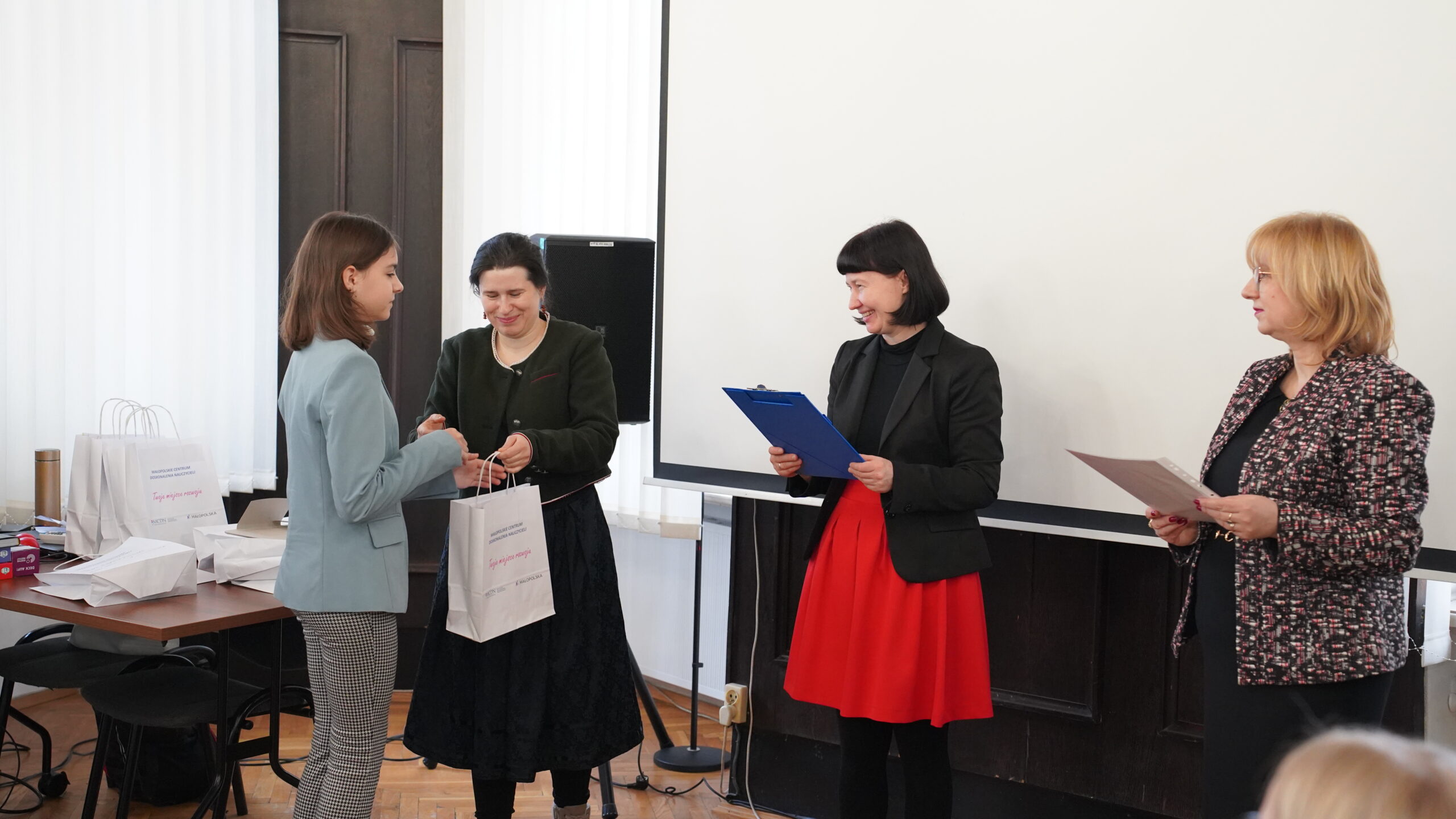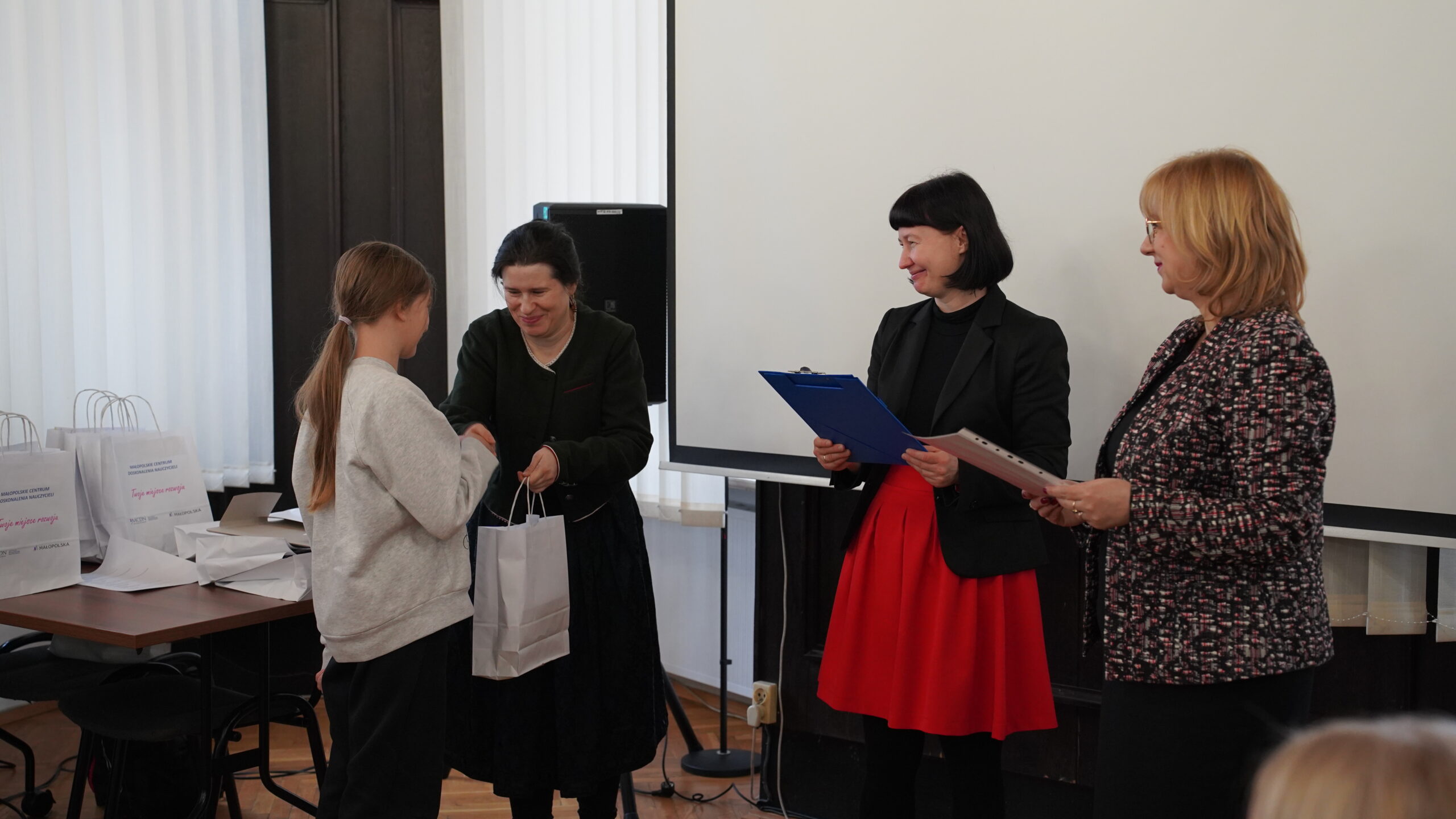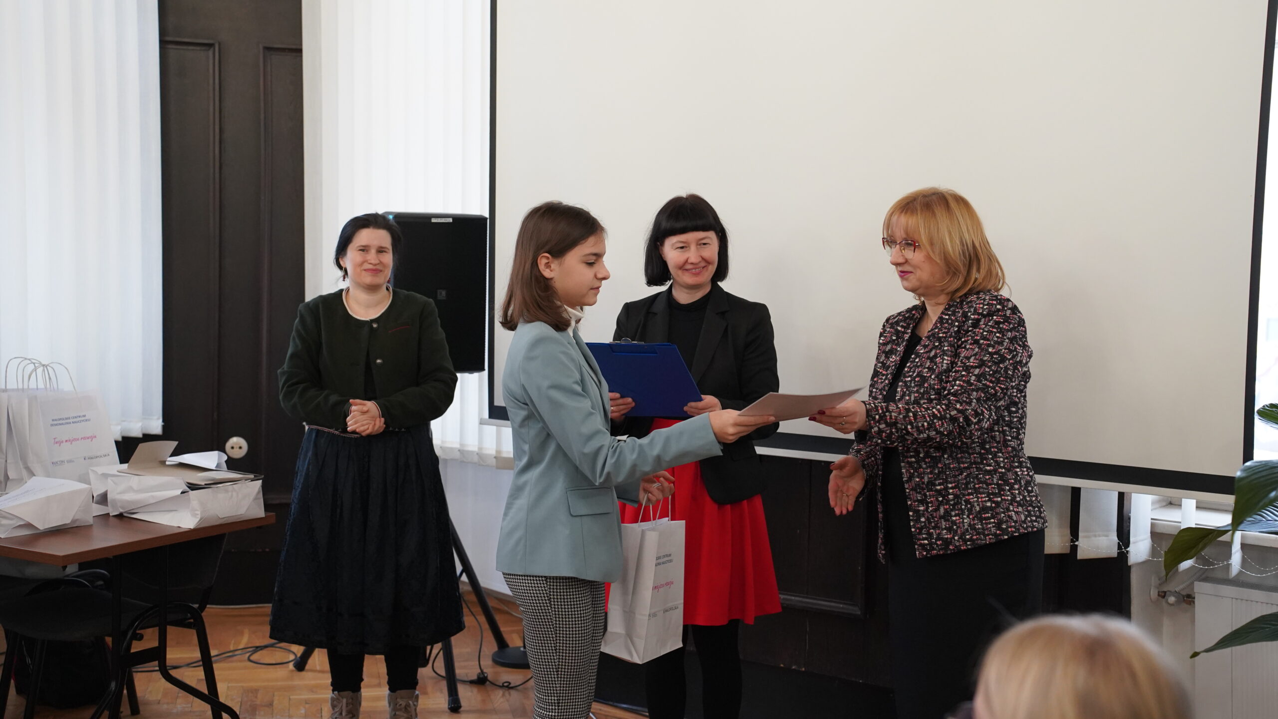Środową uroczystość otworzyła swoim wystąpieniem pani dr Małgorzata Dutka-Mucha, dyrektor MCDN, podkreślając radość z aktywności uczniów oraz zaangażowania nauczycieli języka niemieckiego. Następnie głos zabrała pani Katarzyna Danilewska, przewodnicząca krakowskiego oddziału PSNJN, przedstawiając statystyki konkursowe. Kulminacyjnym momentem wydarzenia było wręczenie nagród wszystkim wyróżnionym uczniom.